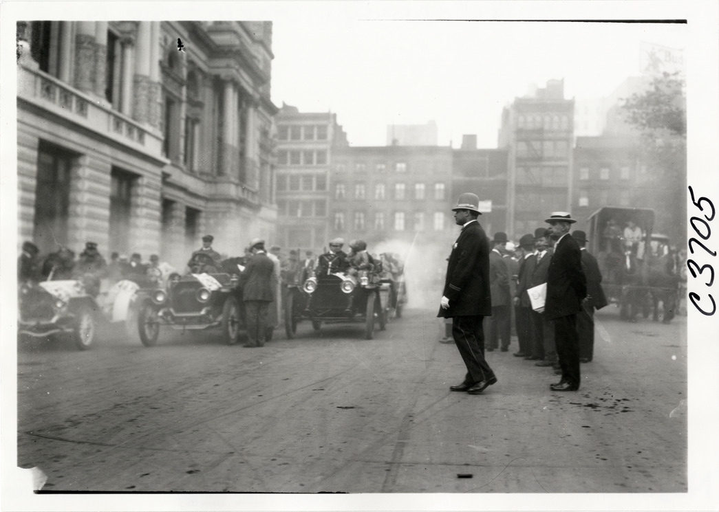 View of motorists with cars lined up in street during the 1910 Munsey Historic Tour. Policeman stands in foreground; commercial buildings in background. Organized by the Munsey newspapers, the endurance contest covered a route through ten states. Handwritten on back: "Tours--Munsey Historic Tour, 1910."