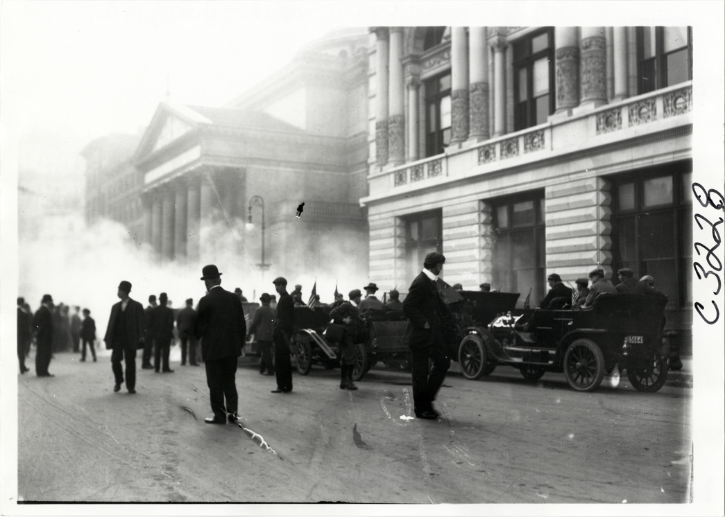 View of motorists and spectators with cars lined up in street during the 1910 Munsey Historic Tour. Stone buildings in background. Organized by the Munsey newspapers, the endurance contest covered a route through ten states. Handwritten on back: "Tours--Munsey Historic Tour, 1910."