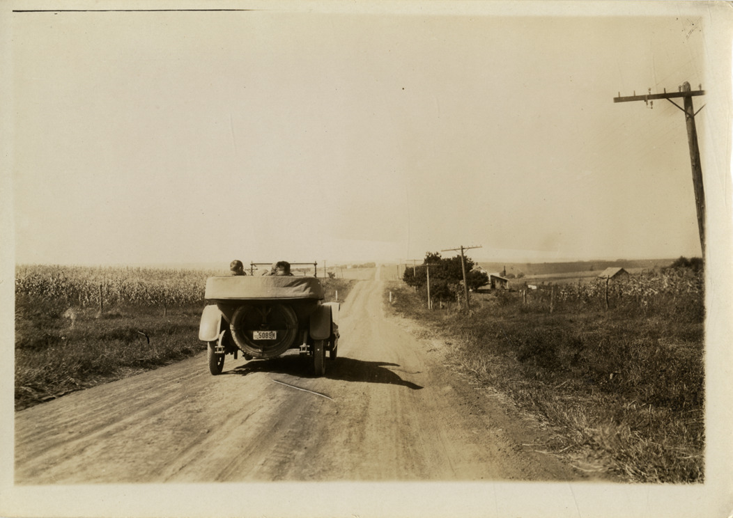 Rear view of motorists in Hupmobile car traveling on rural dirt road during the Hupmobile United American Tour. The tour was also known as the Hupmobile Capital-to-Capital tour. Stamped on back: "N. Lazarnick, automobile photographer, 246 W. 42nd St., Chicago, N.Y., Detroit." Handwritten on back: "Hupp tour, 1916."