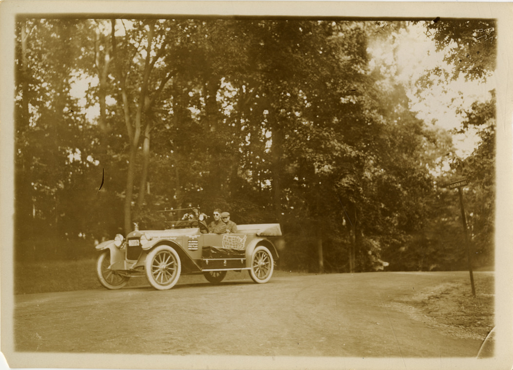View of motorists in Hupmobile car traveling on mountain road near Baltimore, Maryland during the Hupmobile United American Tour. The tour was also known as the Hupmobile Capital-to-Capital tour. Typed on back: "Mountain pass on road to Baltimore, Md. Sent by the Hupp Motor Car Corp." Stamped on back: "N. Lazarnick, automobile photographer, 246 W. 42nd St., Chicago, N.Y., Detroit." Handwritten on back: "Hupp tour, 1916."