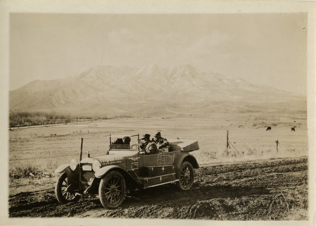 Motorists in Hupmobile automobile on road near mountain range, Hupmobile United American Tour