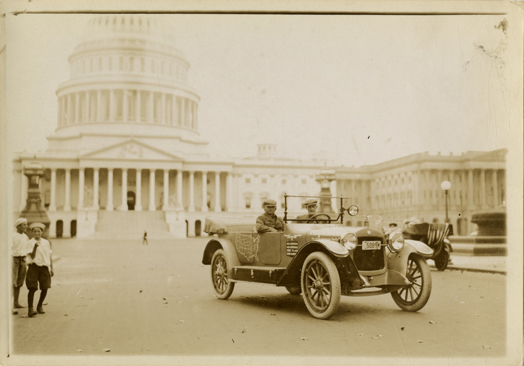 Motorists in Hupmobile automobile posing in front of U.S. Capitol building, Hupmobile United American Tour