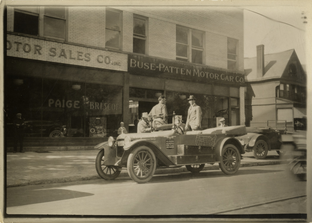 Motorists posing with Hupmobile automobile in front of Buse-Patten Motor Car Company, Hupmobile United American Tour