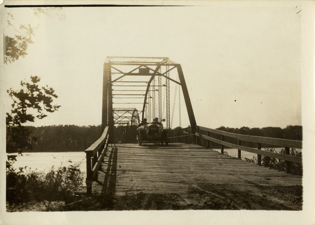 View of motorists in Hupmobile car crossing bridge during the Hupmobile United American Tour. The tour was also known as the Hupmobile Capital-to-Capital tour. Stamped on back: "N. Lazarnick, automobile photographer, 246 W. 42nd St., Chicago, N.Y., Detroit." Handwritten on back: "Hupp tour, 1916."