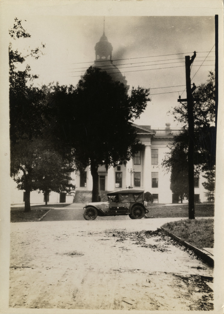 View of Hupmobile car parked in front of unidentified state capitol building during the Hupmobile United American Tour. The tour was also known as the Hupmobile Capital-to-Capital tour. Handwritten on back: "Hupp tour, 1916."