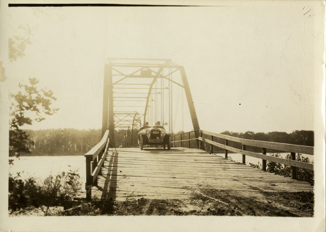 View of motorists in Hupmobile car crossing bridge during the Hupmobile United American Tour. The tour was also known as the Hupmobile Capital-to-Capital tour. Stamped on back: "N. Lazarnick, automobile photographer, 246 W. 42nd St., Chicago, N.Y., Detroit." Handwritten on back: "Hupp tour, 1916."