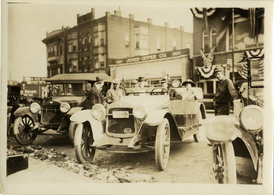 View of motorists posing with Hupmobile car during the Hupmobile United American Tour. Car is parked between two cars next to curb; commercial buildings in background. The tour was also known as the Hupmobile Capital-to-Capital tour. Stamped on back: "N. Lazarnick, automobile photographer, 246 W. 42nd St., Chicago, N.Y., Detroit." Handwritten on back: "Hupp tour, 1916."