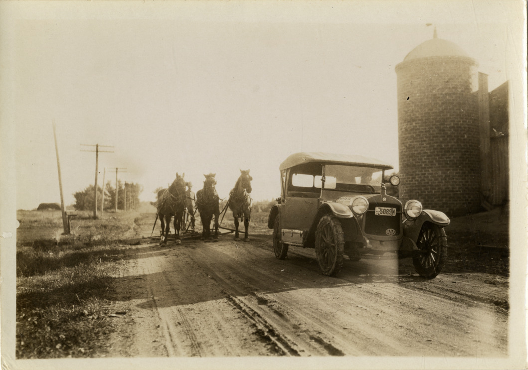 View of team of horses following Hupmobile car on rural road during the Hupmobile United American Tour. Brick silo on right. The tour was also known as the Hupmobile Capital-to-Capital tour. Stamped on back: "N. Lazarnick, automobile photographer, 246 W. 42nd St., Chicago, N.Y., Detroit." Handwritten on back: "Hupp tour, 1916."