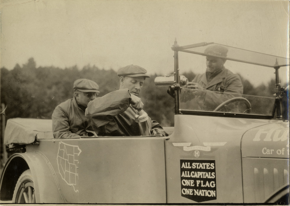 Motorists in Hupmobile automobile pouring beverages from thermos bottles, Hupmobile United American Tour