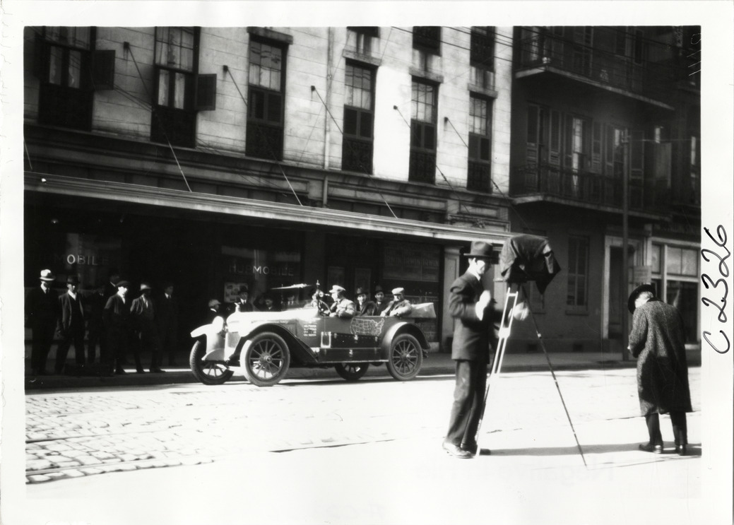 View of motorists in Hupmobile car parked in front of Hupmobile dealership during the Hupmobile United American Tour. Two photographers with cameras in foreground. The tour was also known as the Hupmobile Capital-to-Capital tour. Handwritten on back: "Hupmobile United America [sic] tour, August 28, 1916 - January 21, 1917. Photo by William H. Krohn."