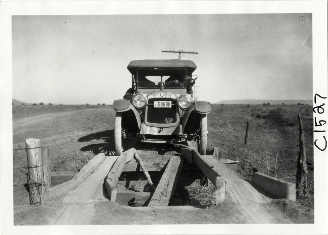 View of Hupmobile car on wooden ramp during the Hupmobile United American Tour. The tour was also known as the Hupmobile Capital-to-Capital tour. Handwritten on back: "Hupmobile United America [sic] tour, August 28, 1916 - January 21, 1917. Photo by William H. Krohn."