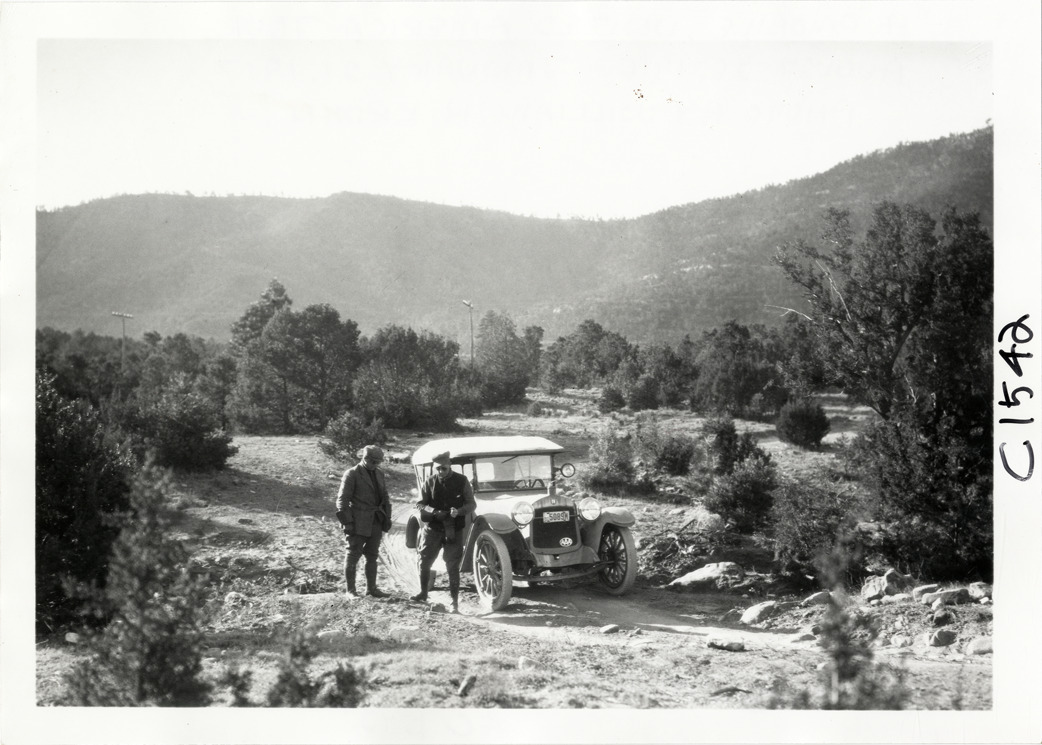 View of motorists with Hupmobile car on rural dirt road during the Hupmobile United American Tour. Hills in background. The tour was also known as the Hupmobile Capital-to-Capital tour. Handwritten on back: "Hupmobile United America [sic] tour, August 28, 1916 - January 21, 1917. Photo by William H. Krohn."