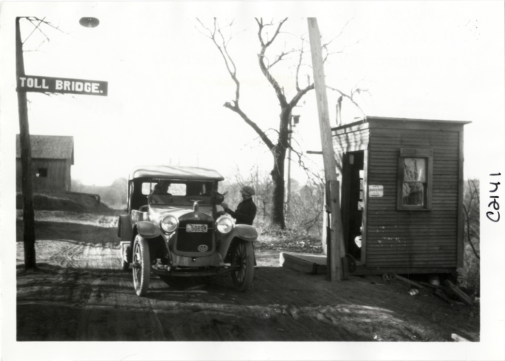 View of motorists in Hupmobile car paying toll for bridge during the Hupmobile United American Tour. "Toll bridge" sign on left; wooden-frame tollhouse on right. The tour was also known as the Hupmobile Capital-to-Capital tour. Handwritten on back: "Hupmobile United America [sic] tour, August 28, 1916 - January 21, 1917. Photo by William H. Krohn."