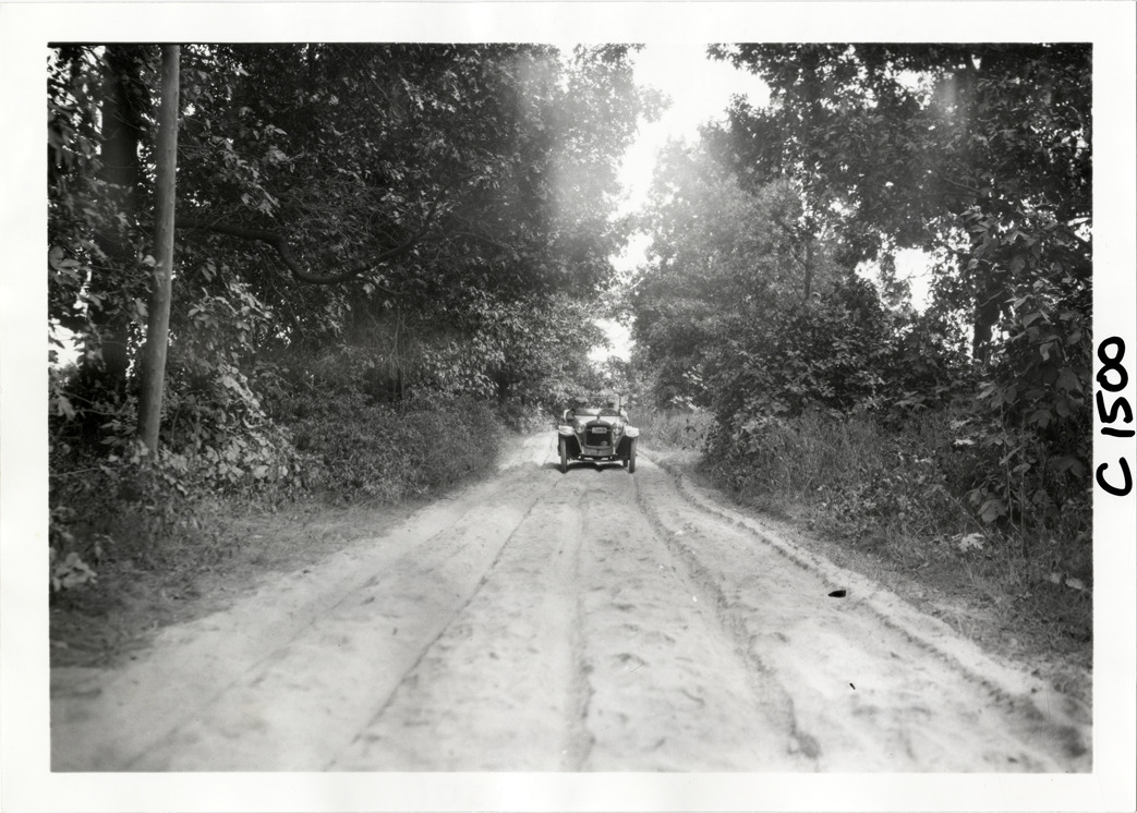 View of motorists in Hupmobile car traveling on tree-lined rural dirt road during the Hupmobile United American Tour. The tour was also known as the Hupmobile Capital-to-Capital tour. Handwritten on back: "Hupmobile United America [sic] tour, August 28, 1916 - January 21, 1917. Photo by William H. Krohn."