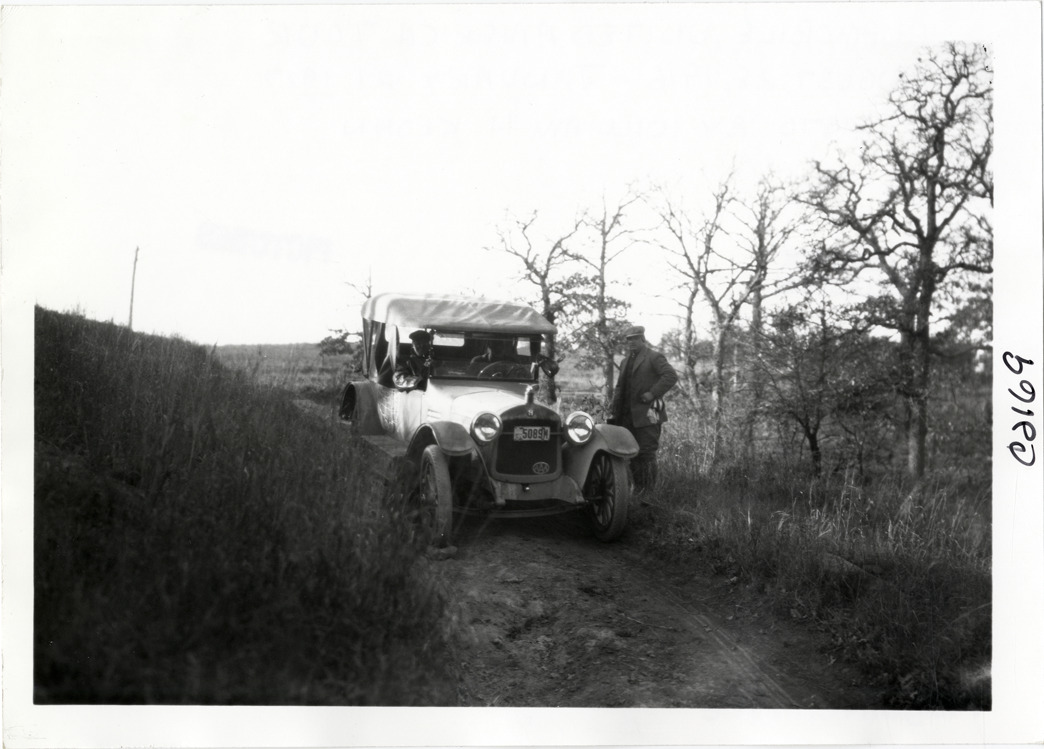 View of motorists with Hupmobile car on rural dirt road during the Hupmobile United American Tour. The tour was also known as the Hupmobile Capital-to-Capital tour. Handwritten on back: "Hupmobile United America [sic] tour, August 28, 1916 - January 21, 1917. Photo by William H. Krohn."