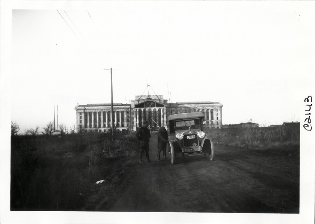 View of Hupmobile car parked in front of Oklahoma state capitol building under construction at Oklahoma City during the Hupmobile United American Tour. The tour was also known as the Hupmobile Capital-to-Capital tour. Handwritten on back: "Hupmobile United America [sic] tour, August 28, 1916 - January 21, 1917. Photo by William H. Krohn. Location: capitol at Oklahoma City, Ok."