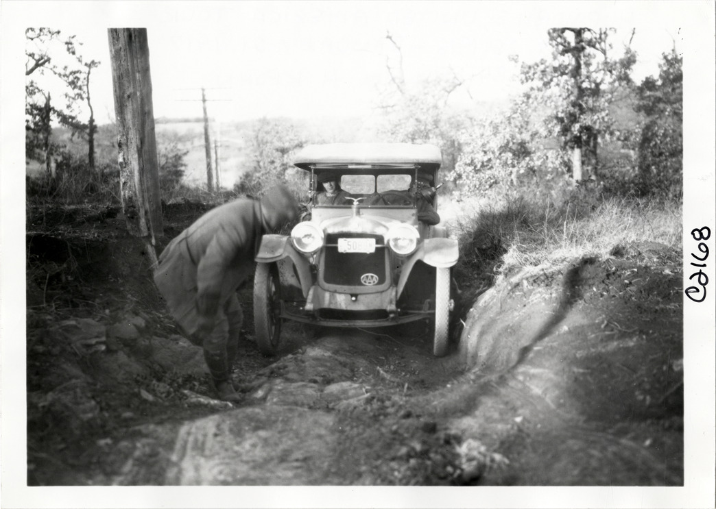 View of motorists with Hupmobile car on rutted rural dirt road during the Hupmobile United American Tour. One man looks at front end of car. The tour was also known as the Hupmobile Capital-to-Capital tour. Handwritten on back: "Hupmobile United America [sic] tour, August 28, 1916 - January 21, 1917. Photo by William H. Krohn."