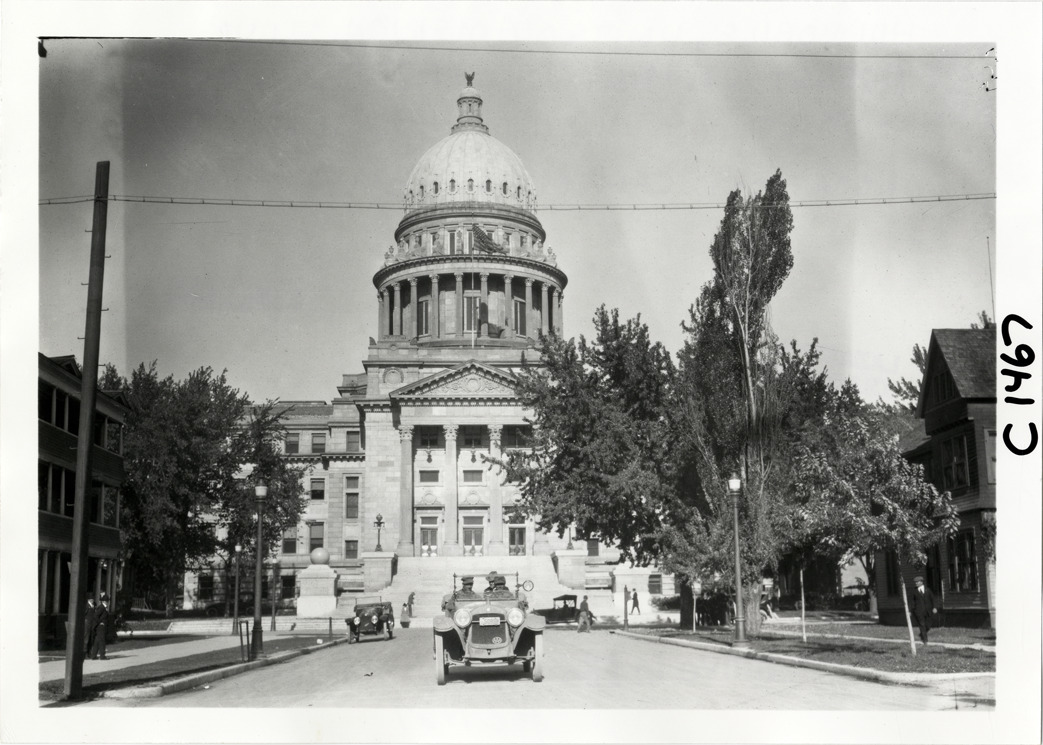 Hupmobile automobile parked in front of Idaho state capitol building, Hupmobile United American Tour