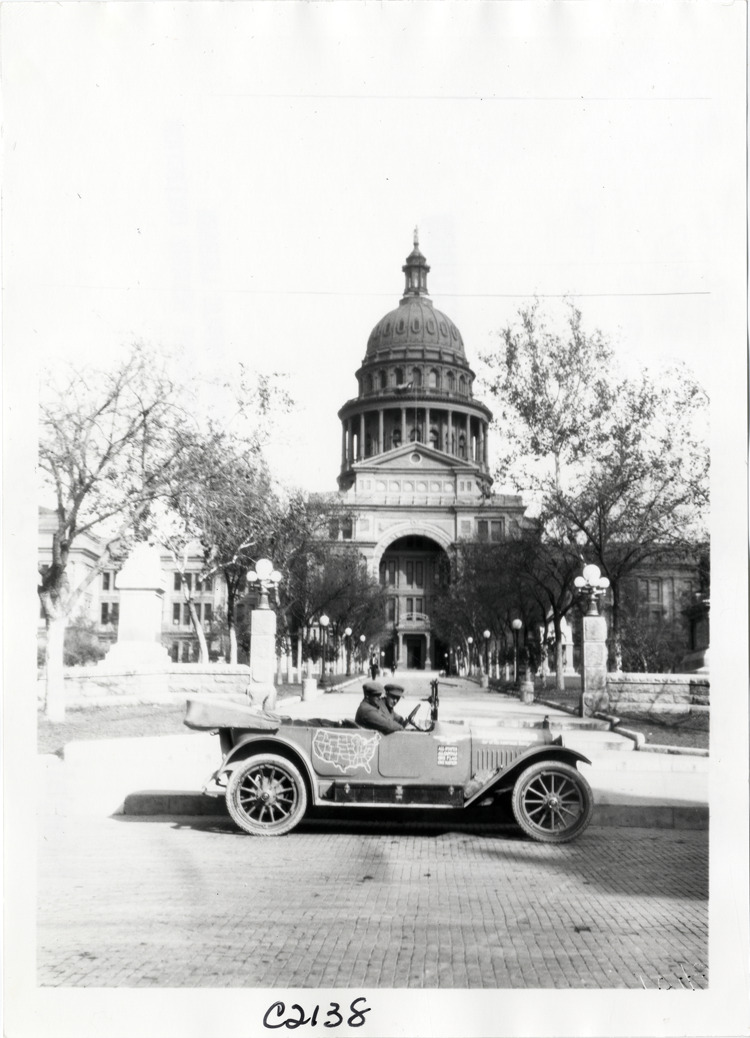 View of motorists posing in Hupmobile car in front of Texas state capitol building at Austin, Texas during the Hupmobile United American Tour. The tour was also known as the Hupmobile Capital-to-Capital tour. Handwritten on back: "Hupmobile United America [sic] tour, August 28, 1916 - January 21, 1917. Photo by William H. Krohn. Location: capitol at Austin, Tx."