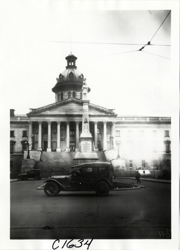View of Hupmobile car parked in front of South Carolina state capitol building and Confederate soldiers' monument at Columbia, South Carolina during the Hupmobile United American Tour. The tour was also known as the Hupmobile Capital-to-Capital tour. Handwritten on back: "Hupmobile United America [sic] tour, August 28, 1916 - January 21, 1917. Photo by William H. Krohn. Location: capitol at Columbia, S.C."