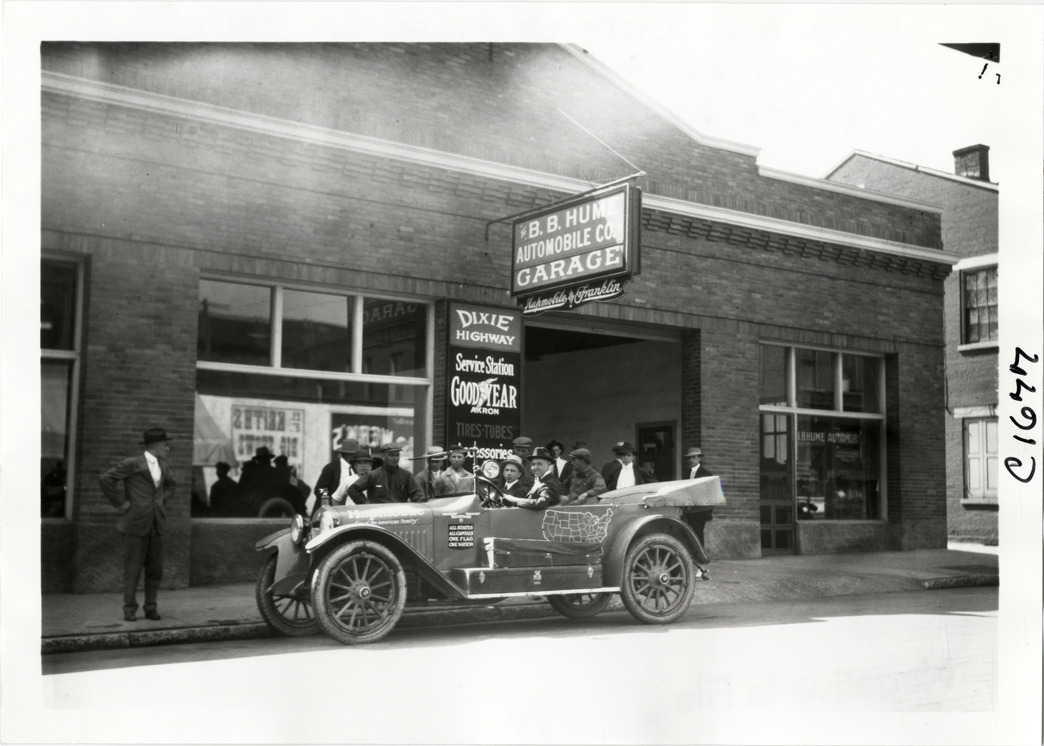 View of motorists in Hupmobile car parked in front of the B.B. Hume Automobile Co. Garage at Covington, Kentucky during the Hupmobile United American Tour. Spectators stand on sidewalk. The tour was also known as the Hupmobile Capital-to-Capital tour. Handwritten on back: "Hupmobile United America [sic] tour, August 28, 1916 - January 21, 1917. Photo by William H. Krohn."