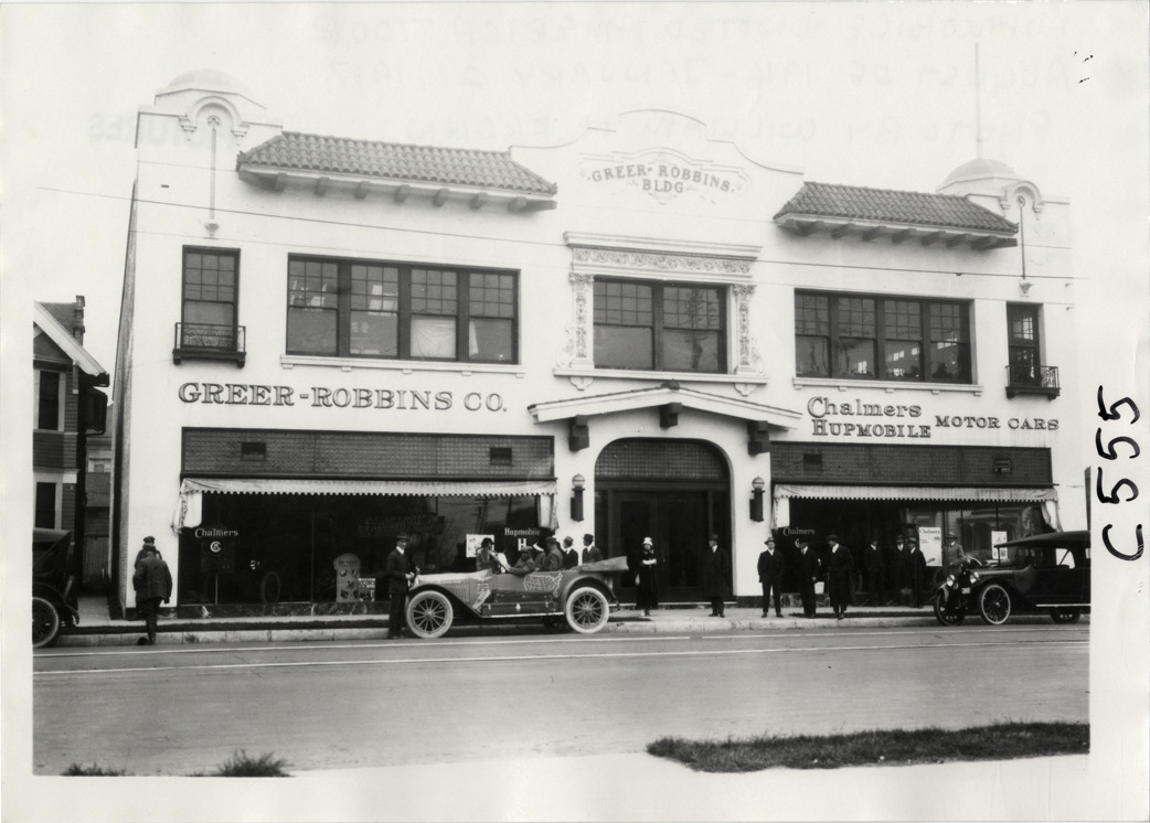 View of Hupmobile car parked in front of the Greer-Robbins Building during the Hupmobile United American Tour. Sign on building reads: "Greer-Robbins Co., Chalmers Hupmobile motor cars." The tour was also known as the Hupmobile Capital-to-Capital tour. Handwritten on back: "Hupmobile United America [sic] tour, August 28, 1916 - January 21, 1917. Photo by William H. Krohn."