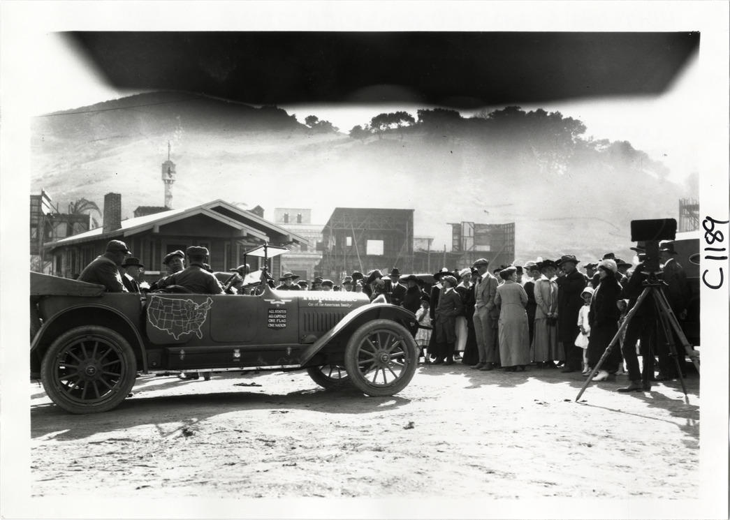 Spectators welcoming motorists in Hupmobile automobile, Hupmobile United American Tour