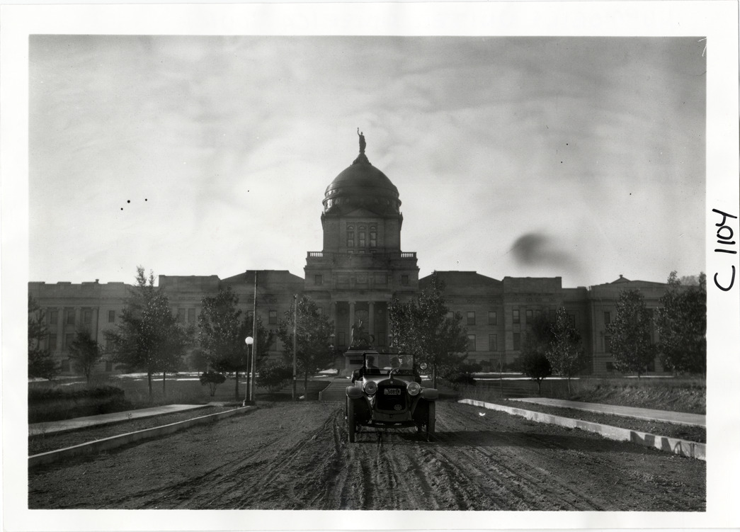View of motorists posing in Hupmobile car in front of Montana state capitol building at Helena, Montana during the Hupmobile United American Tour. The tour was also known as the Hupmobile Capital-to-Capital tour. Handwritten on back: "Hupmobile United America [sic] tour, August 28, 1916 - January 21, 1917. Photo by William H. Krohn. Site is Helena, Mt."