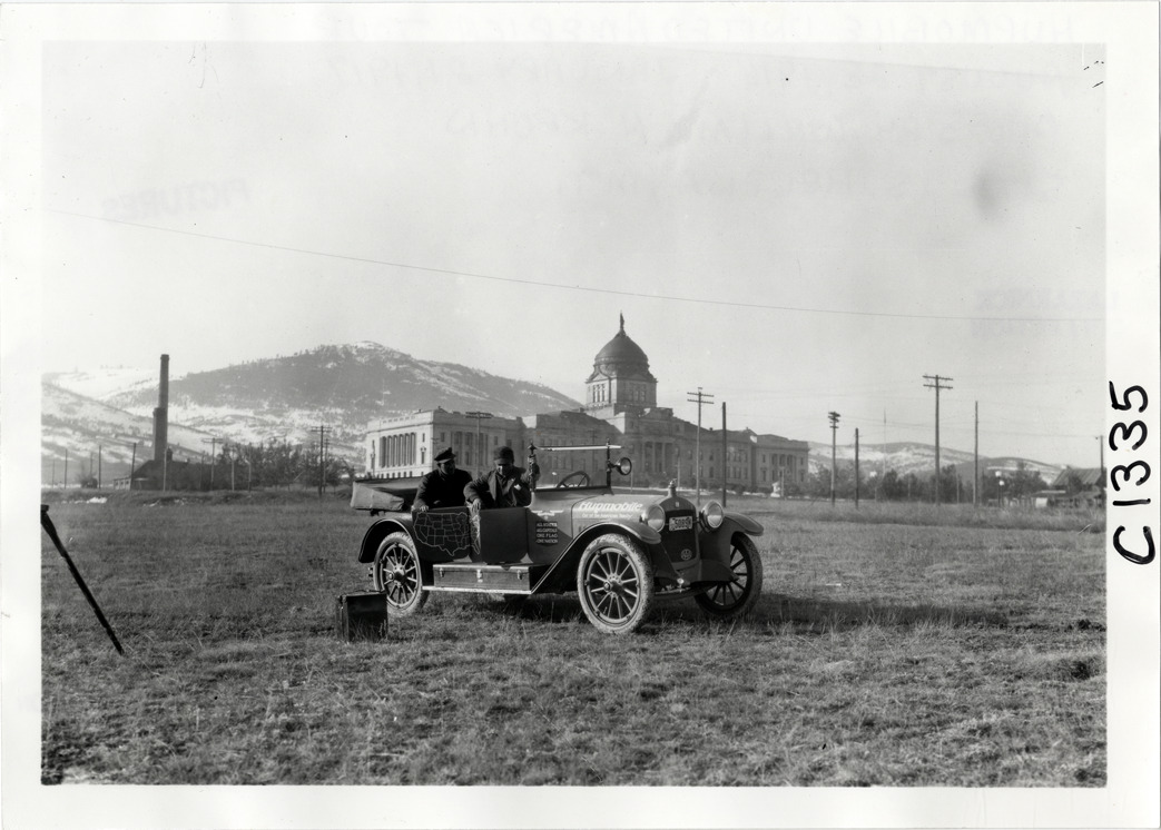 Motorists posing in Hupmobile automobile in front of Montana state capitol building, Hupmobile United American Tour