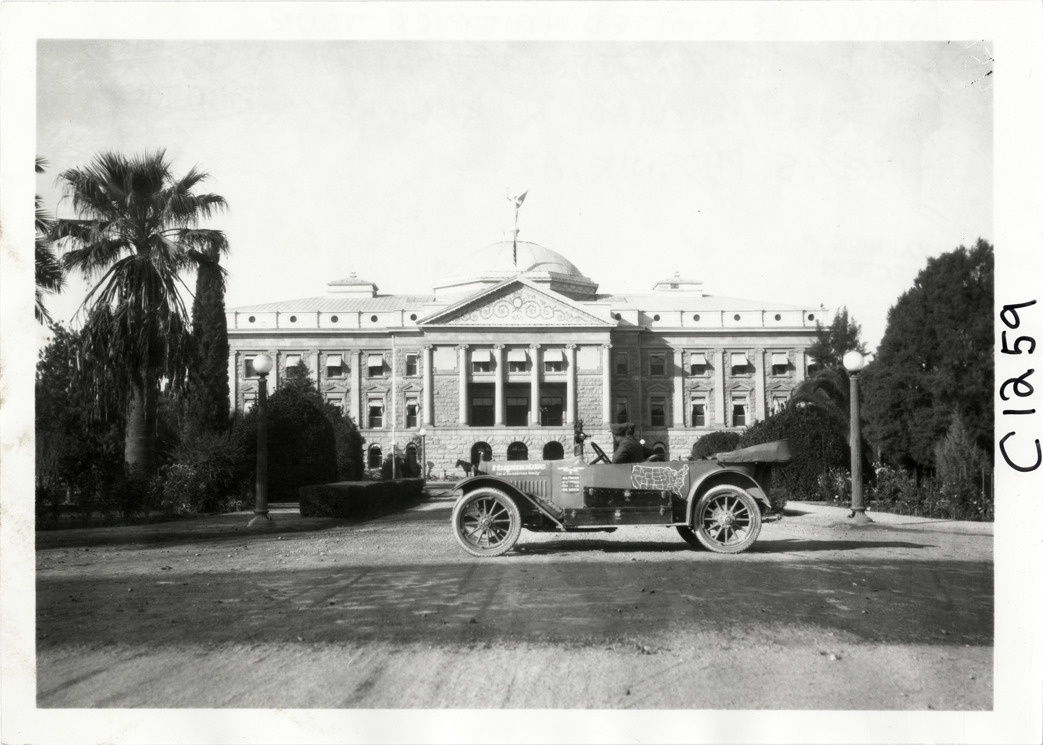 View of motorists in Hupmobile car parked in front of Arizona state capitol building at Phoenix, Arizona during the Hupmobile United American Tour. The tour was also known as the Hupmobile Capital-to-Capital tour. Handwritten on back: "Hupmobile United America [sic] tour, August 28, 1916 - January 21, 1917. Photo by William H. Krohn. Site is Phoenix, Az."
