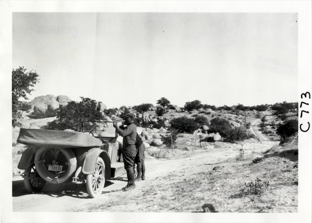 View of motorist drinking from bottle next to Hupmobile car parked on roadside during the Hupmobile United American Tour. Rock formations are visible on landscape. The tour was also known as the Hupmobile Capital-to-Capital tour. Handwritten on back: "Hupmobile United America [sic] tour, August 28, 1916 - January 21, 1917. Photo by William H. Krohn."