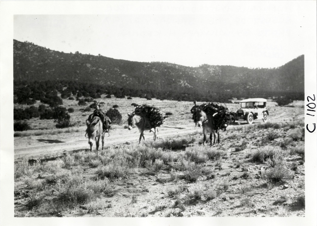 View of motorists with Hupmobile car watching burros carrying packs on desert road during the Hupmobile United American Tour. The tour was also known as the Hupmobile Capital-to-Capital tour. Handwritten on back: "Hupmobile United America [sic] tour, August 28, 1916 - January 21, 1917. Photo by William H. Krohn."