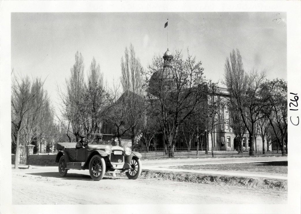 View of motorists in Hupmobile car parked in front of New Mexico state capitol building at Santa Fe, New Mexico during the Hupmobile United American Tour. The tour was also known as the Hupmobile Capital-to-Capital tour. Handwritten on back: "Hupmobile United America [sic] tour, August 28, 1916 - January 21, 1917. Photo by William H. Krohn. Site is Santa Fe, N.M."