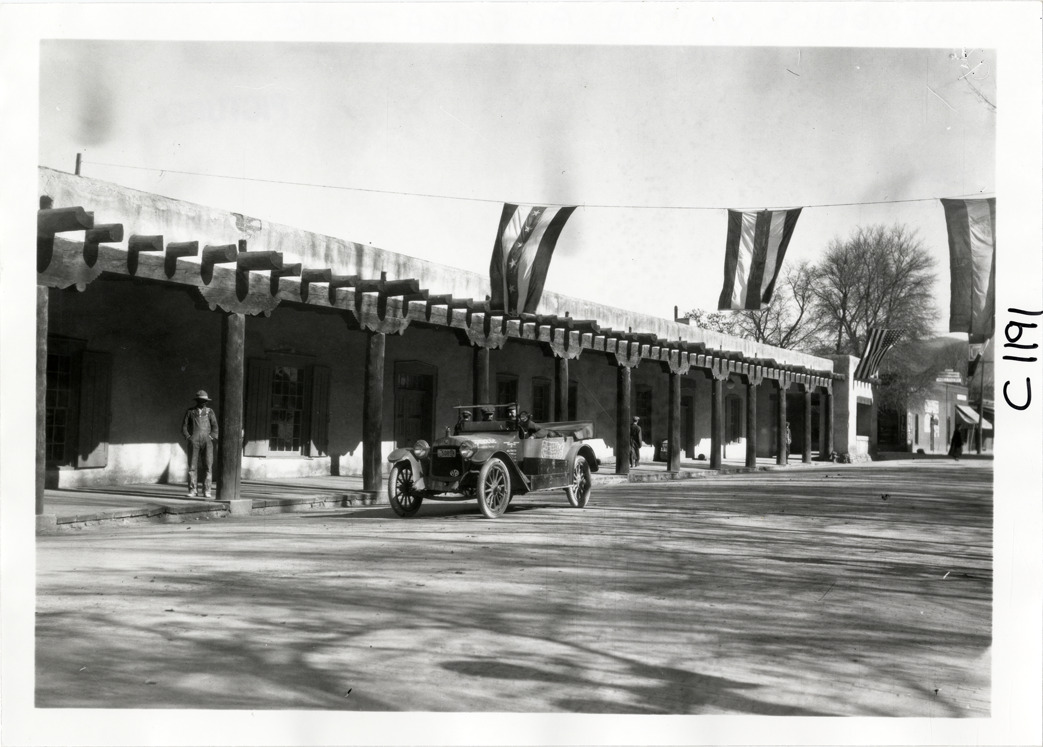 View of motorists in Hupmobile car parked in front of Pueblo style building during the Hupmobile United American Tour. Flags are suspended over street. The tour was also known as the Hupmobile Capital-to-Capital tour. Handwritten on back: "Hupmobile United America [sic] tour, August 28, 1916 - January 21, 1917. Photo by William H. Krohn."