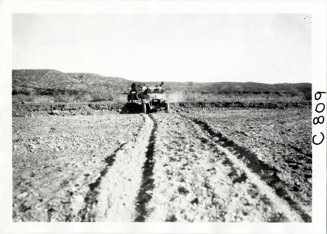View of motorists with Hupmobile car on desert road during the Hupmobile United American Tour. Unidentified car in background. The tour was also known as the Hupmobile Capital-to-Capital tour. Handwritten on back: "Hupmobile United America [sic] tour, August 28, 1916 - January 21, 1917. Photo by William H. Krohn."