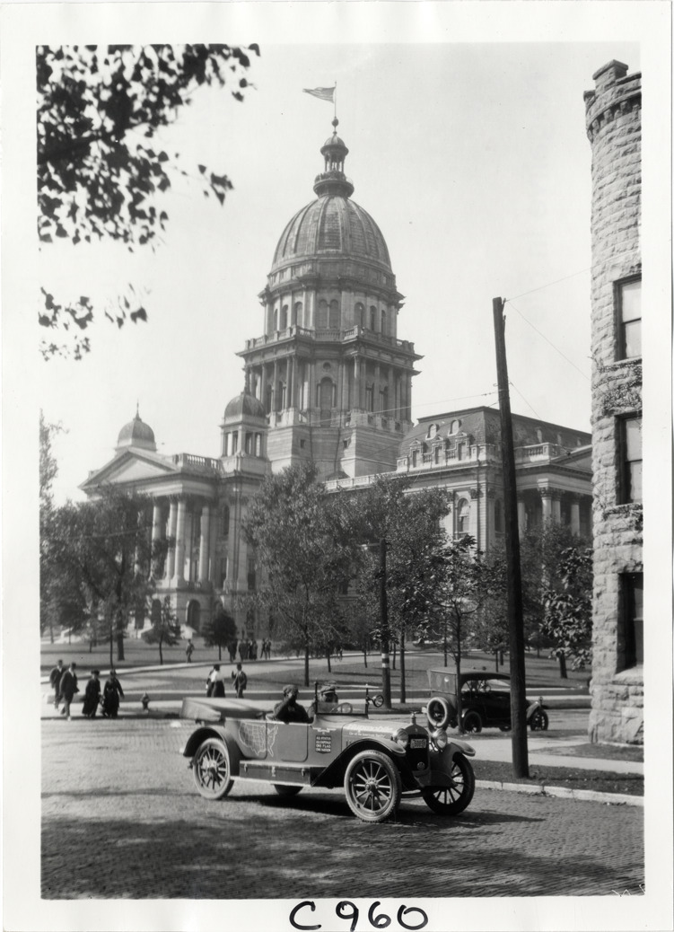 Hupmobile automobile parked in front of Illinois state capitol building, Hupmobile United American Tour