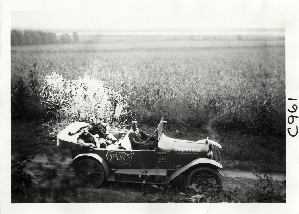 Motorists posing in Hupmobile automobile in cornfield near Illinois River corn belt, Hupmobile United American Tour
