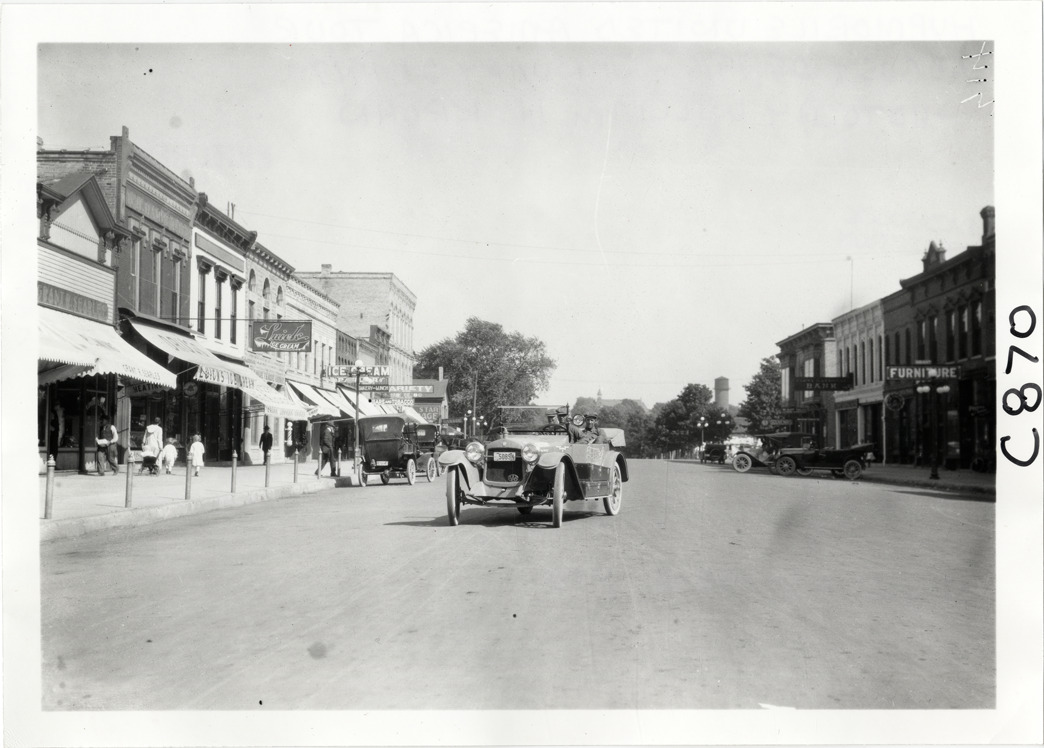 View of motorists in Hupmobile car on commercial street during the Hupmobile United American Tour. Luicks ice cream parlor on left. The tour was also known as the Hupmobile Capital-to-Capital tour. Handwritten on back: "Hupmobile United America [sic] tour, August 28, 1916 - January 21, 1917. Photo by William H. Krohn."