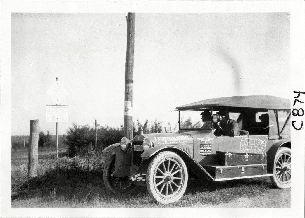 Motorists in Hupmobile automobile reading roadside sign near St. Louis, Missouri, Hupmobile United American Tour