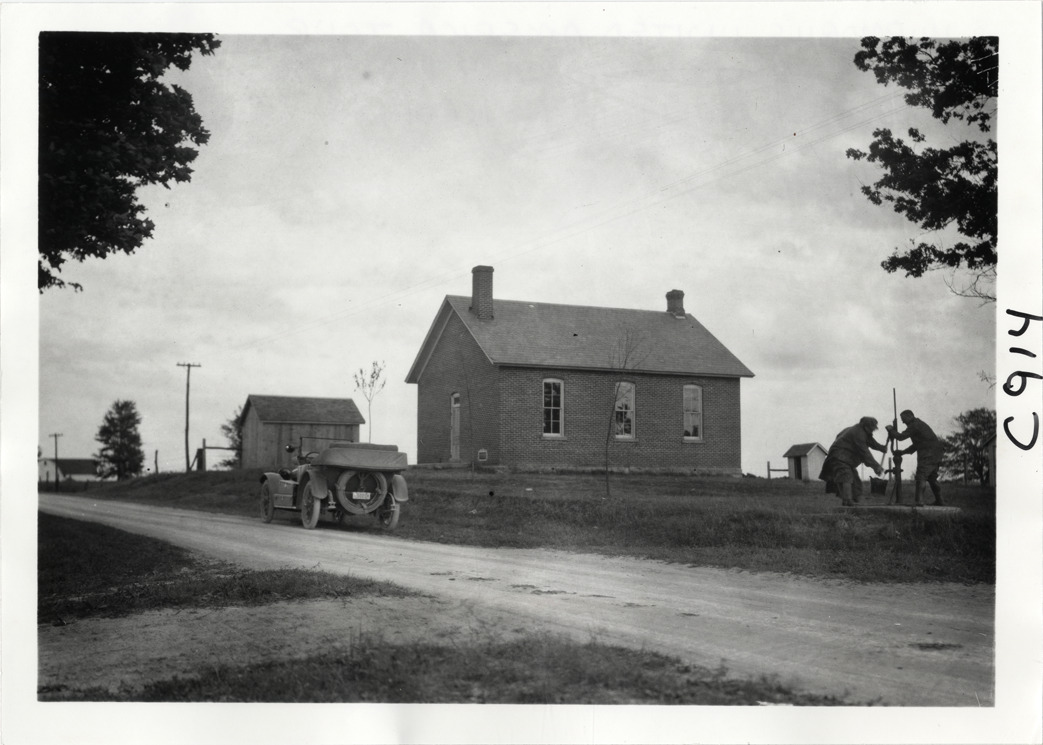 View of motorists with Hupmobile car pumping water from well on roadside during the Hupmobile United American Tour. Front-gabled brick schoolhouse in background. The tour was also known as the Hupmobile Capital-to-Capital tour. Handwritten on back: "Hupmobile United America [sic] tour, August 28, 1916 - January 21, 1917. Photo by William H. Krohn."