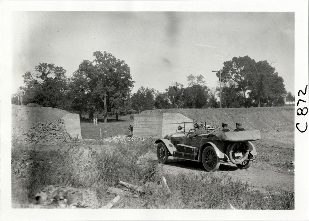 View of motorists in Hupmobile car traveling on road through embankment near Jefferson City, Missouri during the Hupmobile United American Tour. The tour was also known as the Hupmobile Capital-to-Capital tour. Handwritten on back: "Hupmobile United America [sic] tour, August 28, 1916 - January 21, 1917. Photo by William H. Krohn. Site is outside of Jefferson City, Mo."
