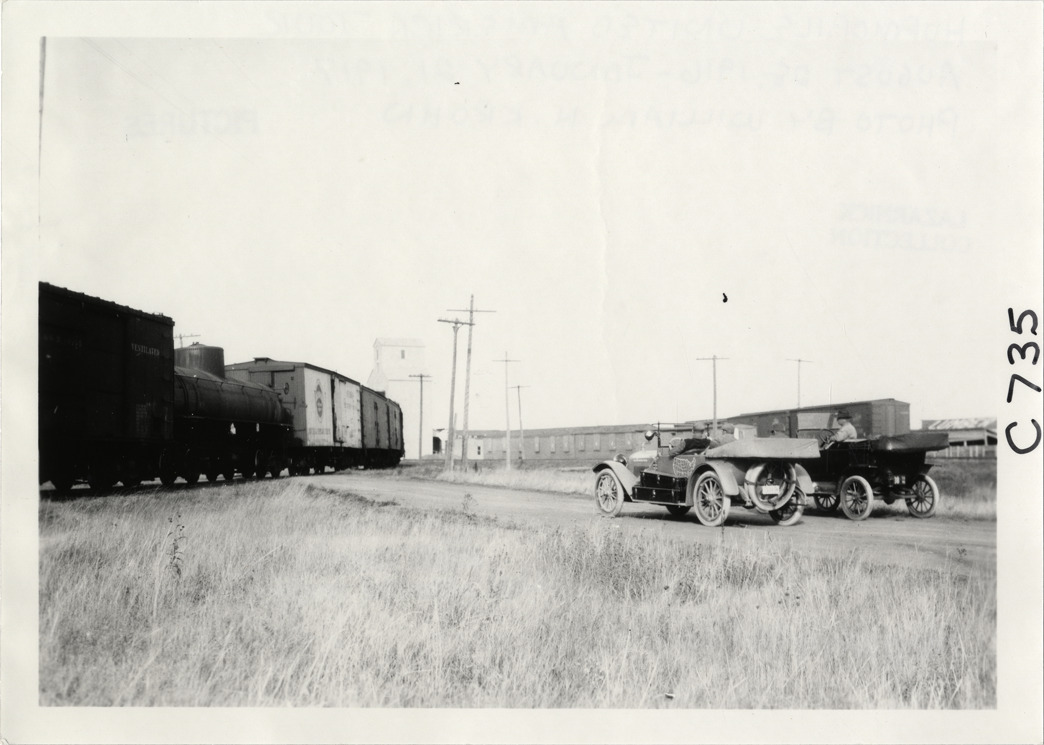 View of motorists in Hupmobile car and unidentified car at railroad crossing during the Hupmobile United American Tour. Freight cars on railroad tracks in background. The tour was also known as the Hupmobile Capital-to-Capital tour. Handwritten on back: "Hupmobile United America [sic] tour, August 28, 1916 - January 21, 1917. Photo by William H. Krohn."