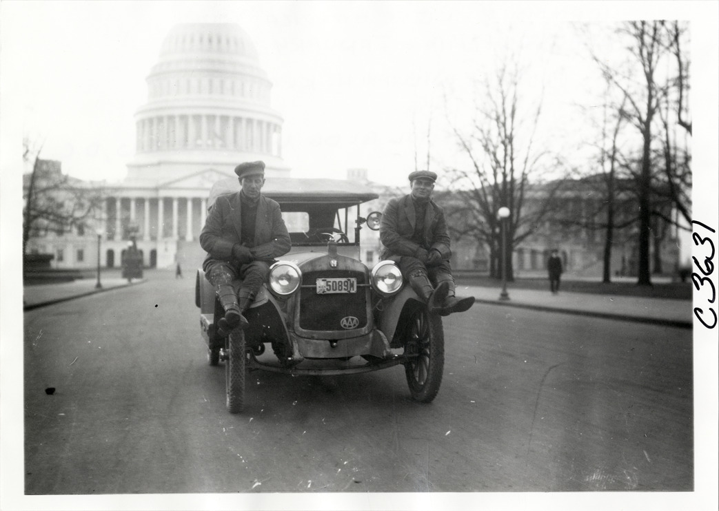 Motorists posing with Hupmobile automobile in front of U.S. Capitol building, Hupmobile United American Tour