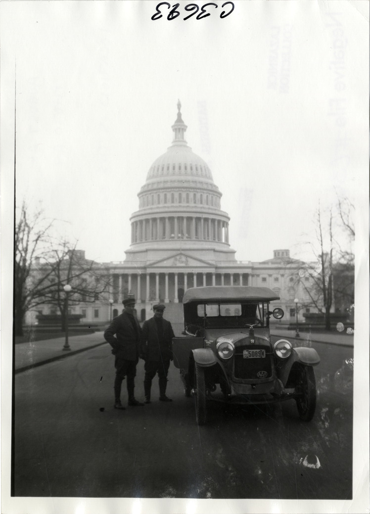Motorists posing with Hupmobile automobile in front of U.S. Capitol building, Hupmobile United American Tour