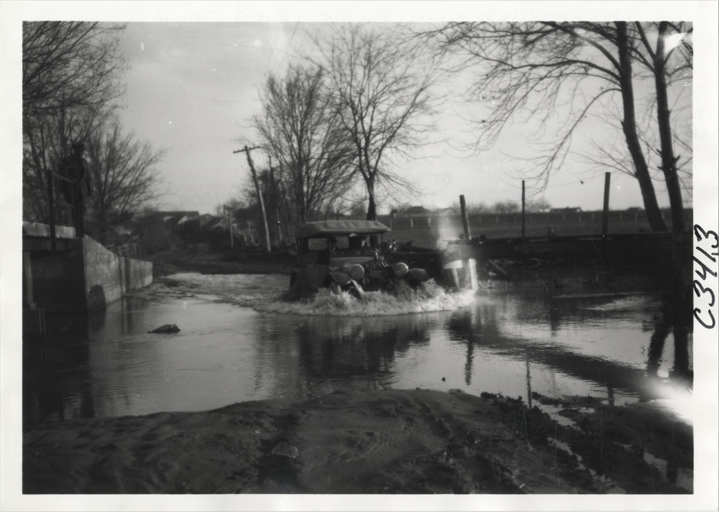 View of motorists in Hupmobile car fording river or stream during the Hupmobile United American Tour. The tour was also known as the Hupmobile Capital-to-Capital tour. Handwritten on back: "Hupmobile United America [sic] tour, August 28, 1916 - January 21, 1917. Photo by William H. Krohn."