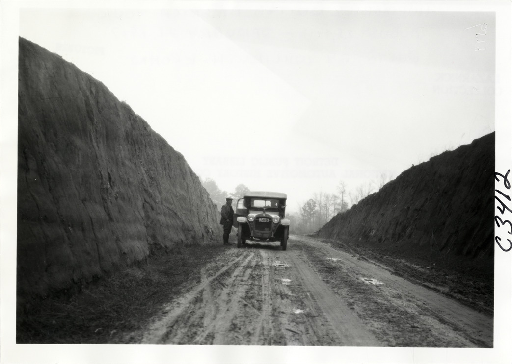 View of motorist standing next to Hupmobile car on dirt road during the Hupmobile United American Tour. Road has steep embankments. The tour was also known as the Hupmobile Capital-to-Capital tour. Handwritten on back: "Hupmobile United America [sic] tour, August 28, 1916 - January 21, 1917. Photo by William H. Krohn."