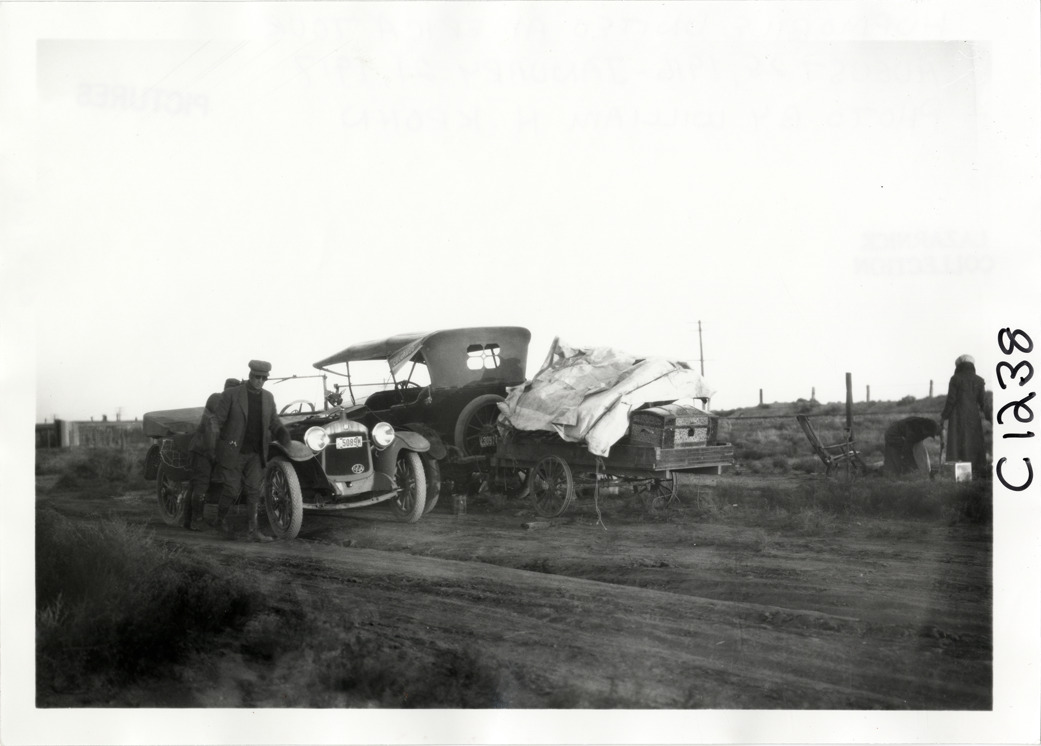 View of Hupmobile car next to a car towing a trailer on rural dirt road during the Hupmobile United American Tour. Trailer is covered with a tarpaulin; trunk is visible on end of trailer. The tour was also known as the Hupmobile Capital-to-Capital tour. Handwritten on back: "Hupmobile United America [sic] tour, August 28, 1916 - January 21, 1917. Photo by William H. Krohn."