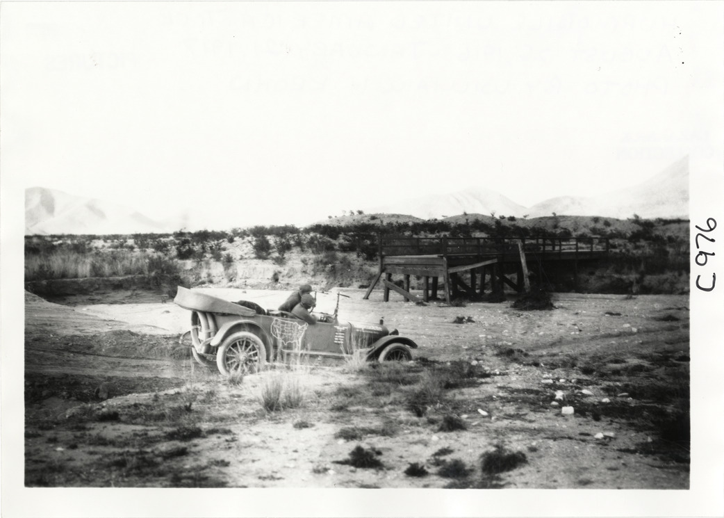 View of motorists in Hupmobile car crossing a dry riverbed during the Hupmobile United American Tour. Dilapidated bridge in background. The tour was also known as the Hupmobile Capital-to-Capital tour. Handwritten on back: "Hupmobile United America [sic] tour, August 28, 1916 - January 21, 1917. Photo by William H. Krohn."