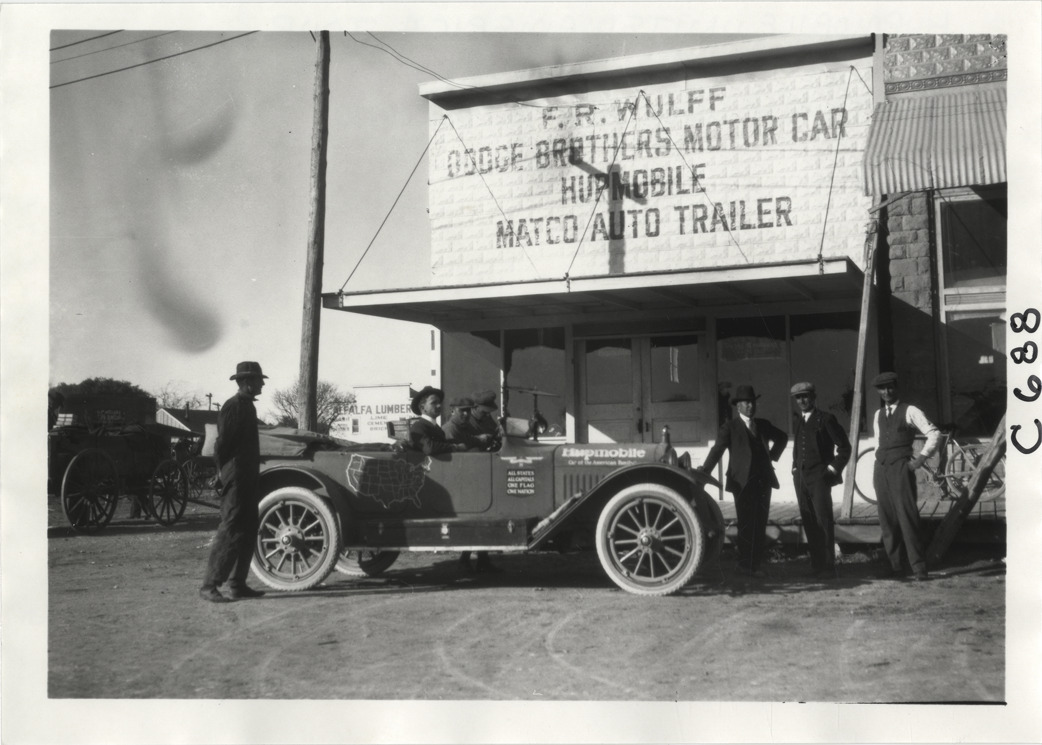 Motorists posing in Hupmobile automobile at F.R. Wulff dealership, Hupmobile United American Tour