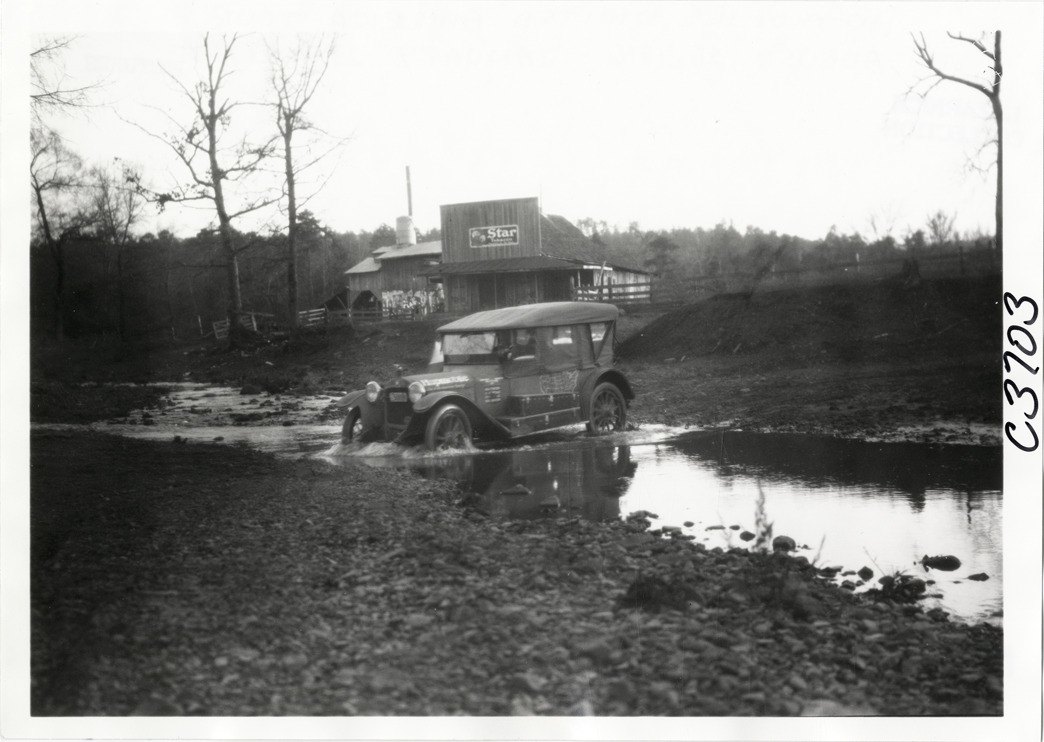 View of Hupmobile car crossing stream or river during the Hupmobile United American Tour. Wooden-frame building with "Star tobacco" sign in background. The tour was also known as the Hupmobile Capital-to-Capital tour. Handwritten on back: "Hupmobile United America [sic] tour, August 28, 1916 - January 21, 1917. Photo by William H. Krohn."